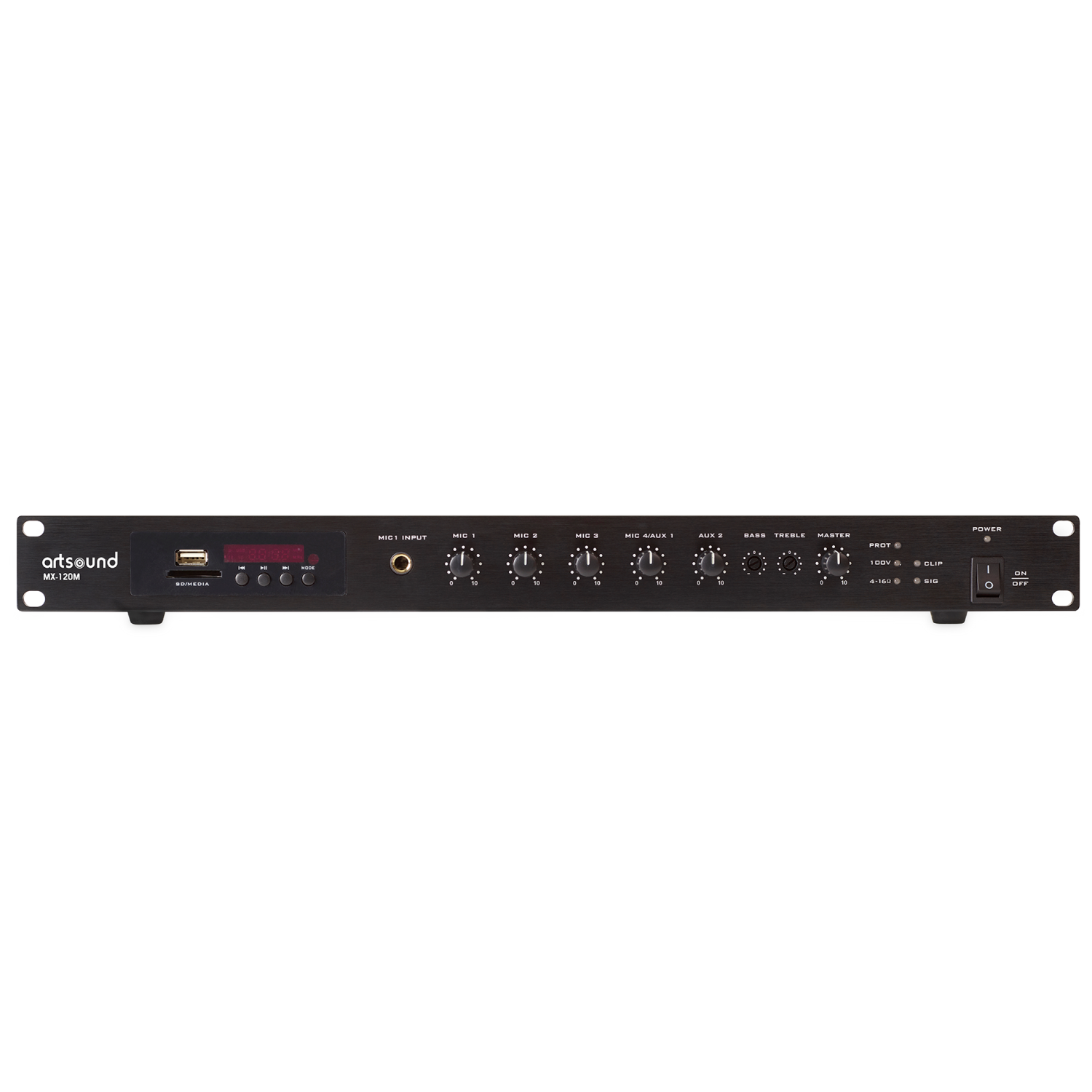 Compact and universally deployable mixing amplifier that pumps out 120 Watts. The MX-120M has integrated FM with Bluetooth and a treble/bass tone control on board. It has individual input gain control (3 channels) and is protected against short-circuit and thermal overload.