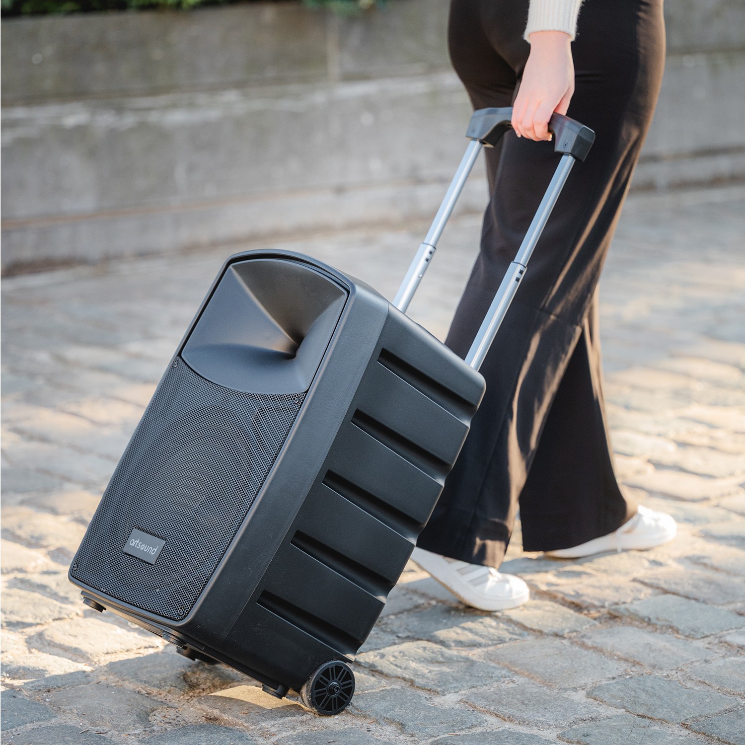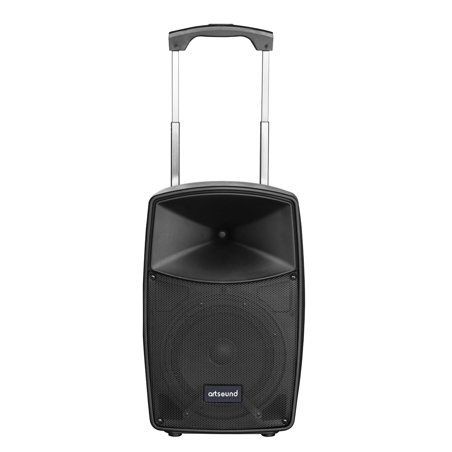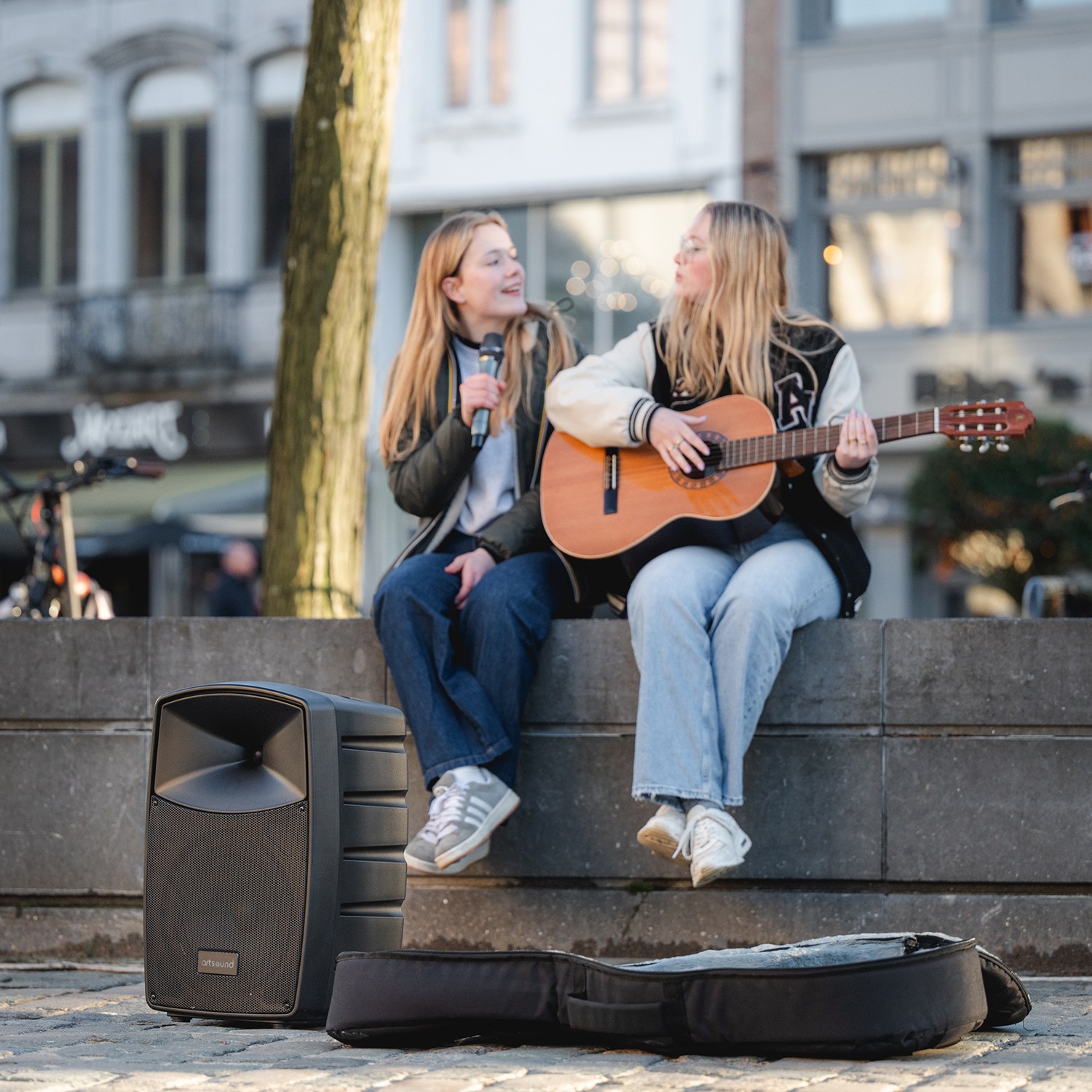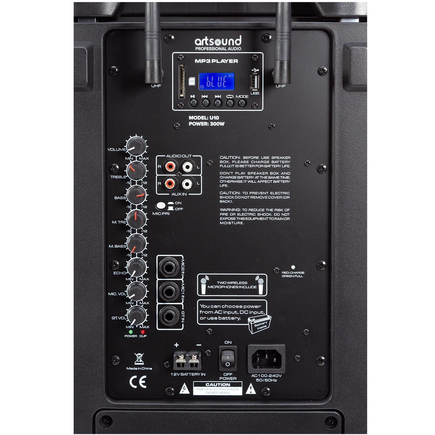 De ArtSound U10 mobiele speaker rolt overal de loper uit voor jouw stem en jouw muziek. De stevige wielen, het handige handvat, de oplaadbare batterij en de twee draadloze microfoons bieden grenzeloze mogelijkheden. Met een piekvermogen tot 300W maakt het niet uit of je publiek nu 10 dan wel 100 man sterk is. Hen op muziek trakteren doe je vlotjes via bluetooth, USB of SD kaart. Neem gerust ook je gitaar, extra microfoons en gelijk welke audiobron mee: aansluitingen te over. En had je graag een statief voor nog meer bereik? Dat kan ook!