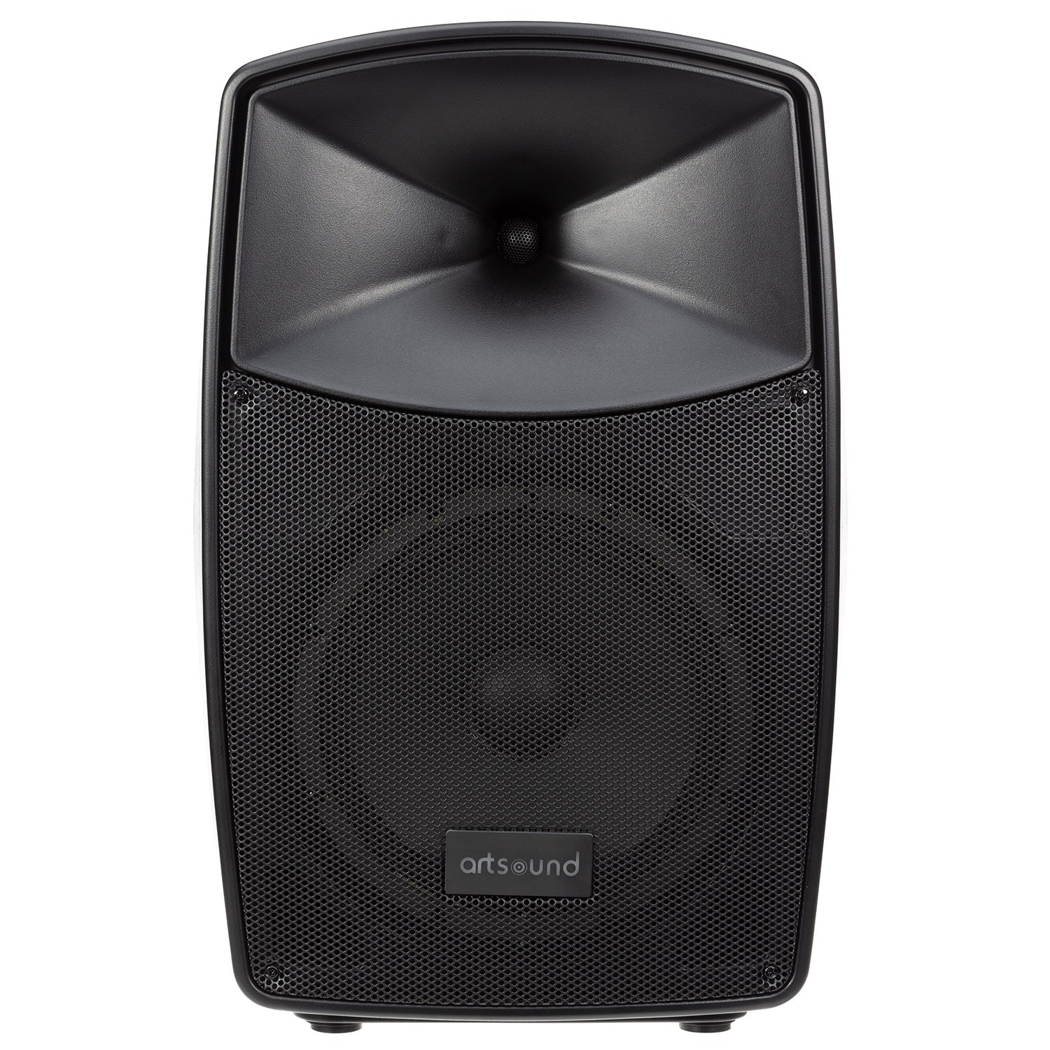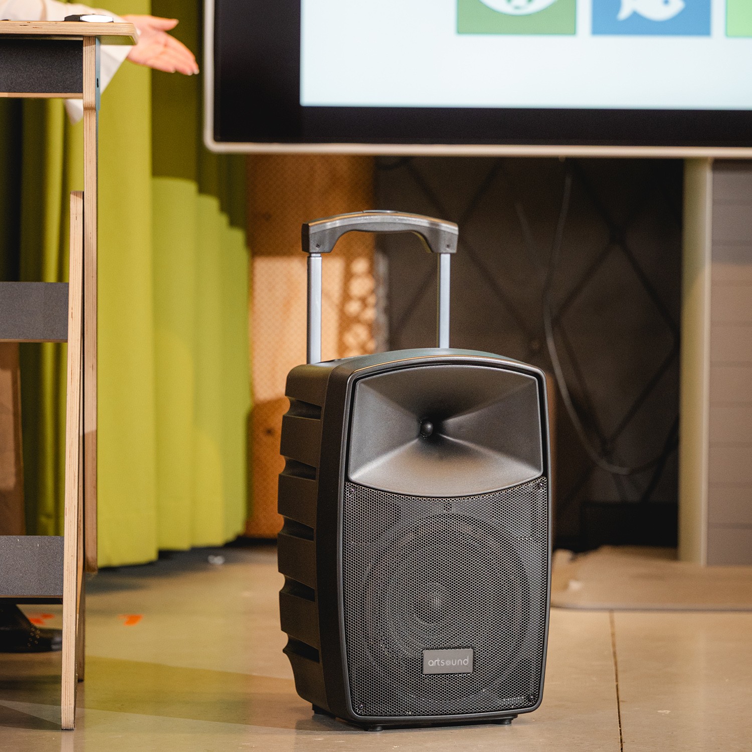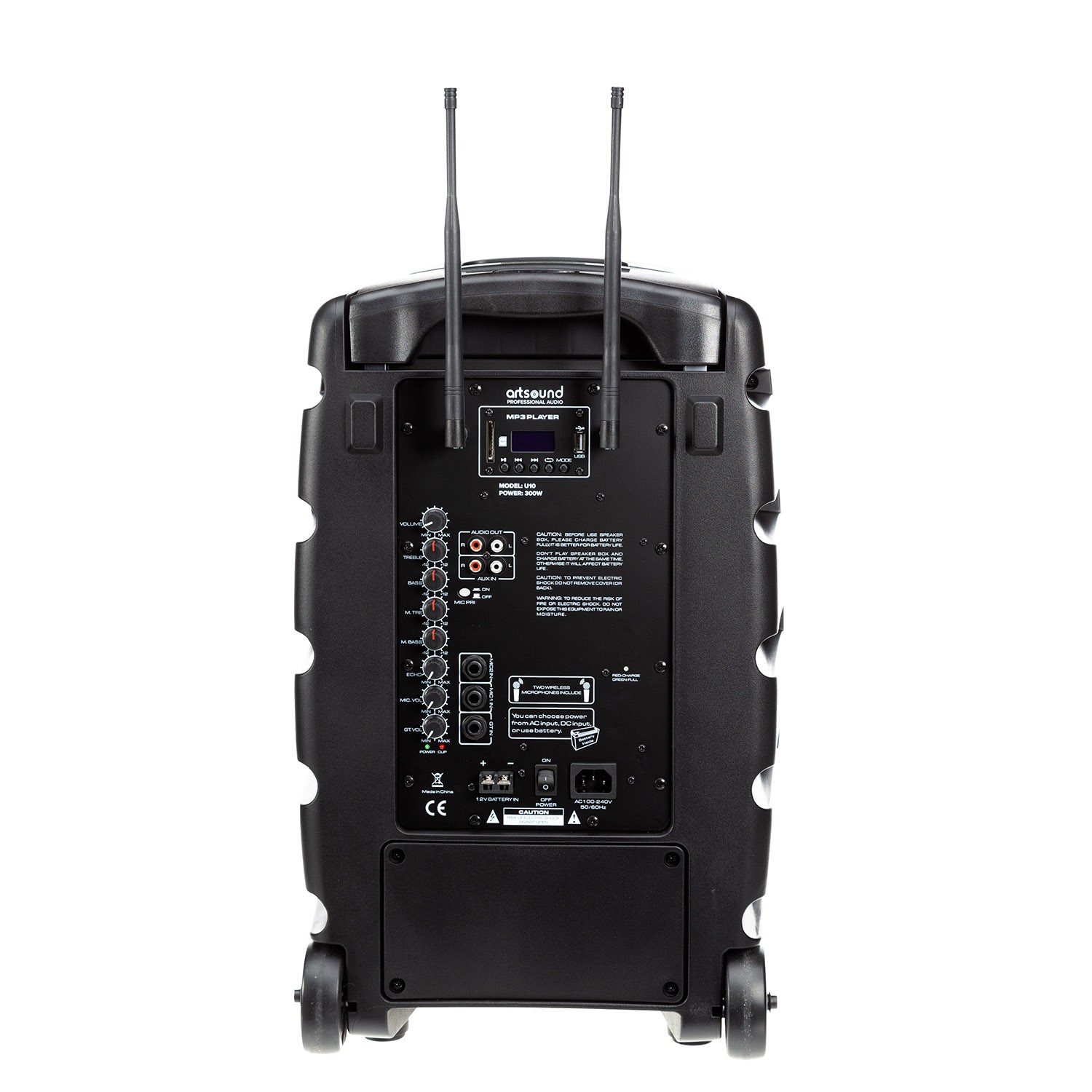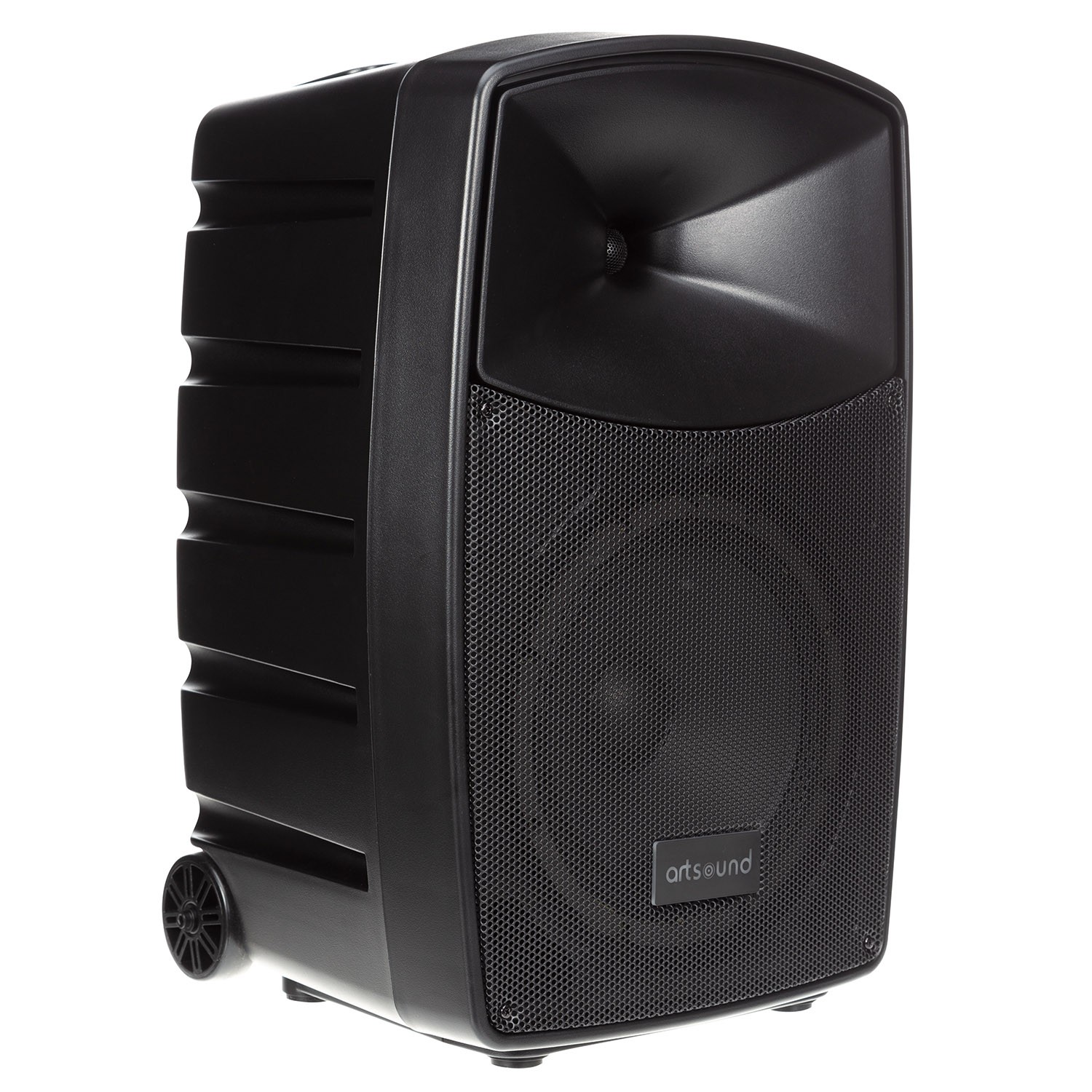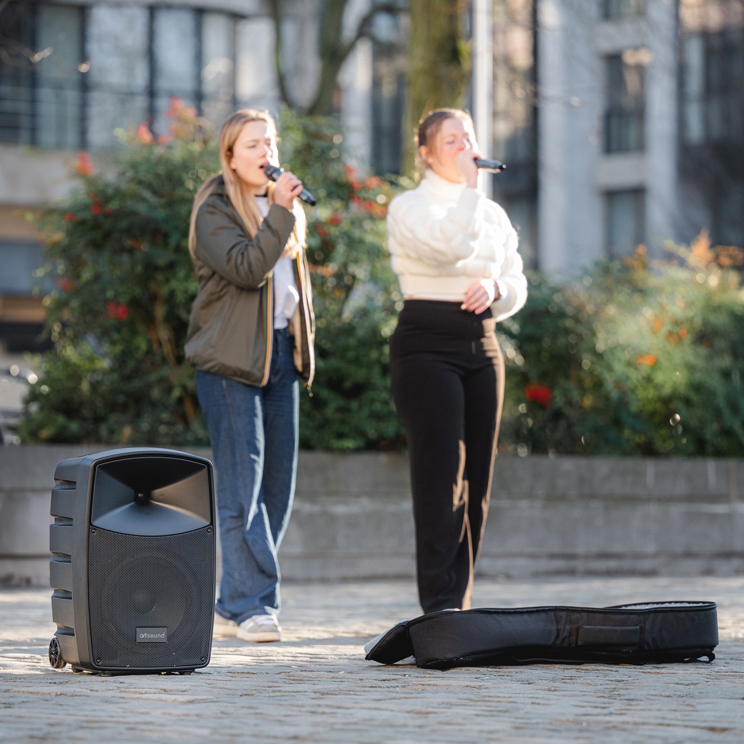 De ArtSound U10 mobiele speaker rolt overal de loper uit voor jouw stem en jouw muziek. De stevige wielen, het handige handvat, de oplaadbare batterij en de twee draadloze microfoons bieden grenzeloze mogelijkheden. Met een piekvermogen tot 300W maakt het niet uit of je publiek nu 10 dan wel 100 man sterk is. Hen op muziek trakteren doe je vlotjes via bluetooth, USB of SD kaart. Neem gerust ook je gitaar, extra microfoons en gelijk welke audiobron mee: aansluitingen te over. En had je graag een statief voor nog meer bereik? Dat kan ook!